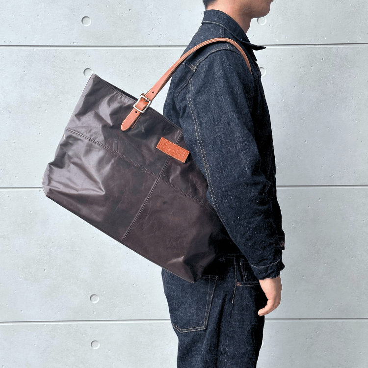 4枚の革を繋ぎ合わせる事で、用尺を効率よくして 単価を抑えています。持ち手部分は栃木レザーのベルト用の革を使用しており、伸びがなく 使い込むことによる柔らかさ・色の変化をボディとともに感じていただけます。