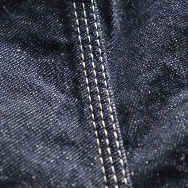 キナリ糸によるトリプルステッチ巻縫いの堅牢な縫製仕様などの