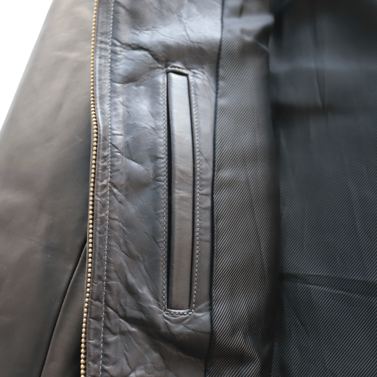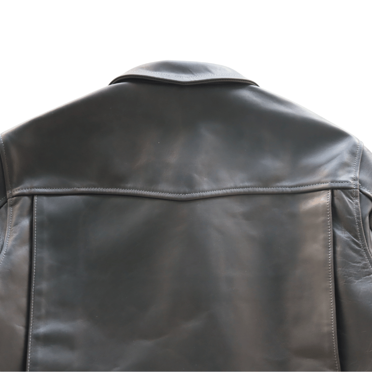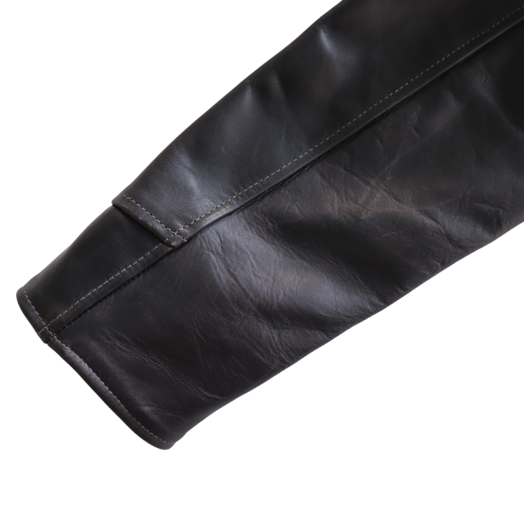 黒染料とパラフィンフィニッシュを施した茶芯のレザーは、