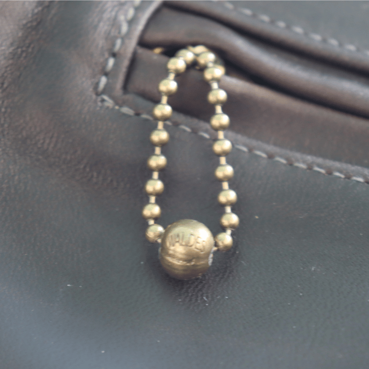 WALDESのファスナーとボールチェーン。開閉により革の経年変化がでやすい。