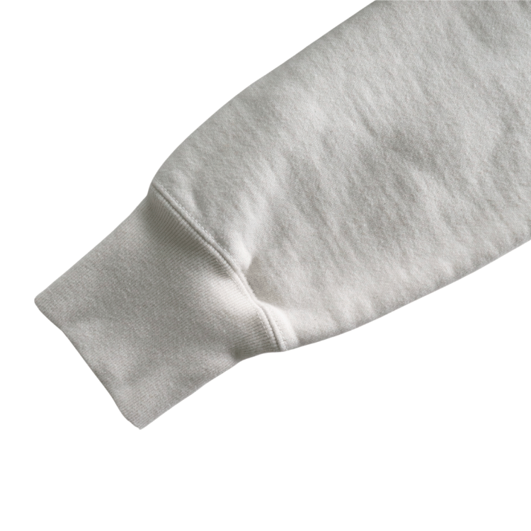 和歌山にて旧式吊編機により製造する吊裏毛素材。本来この旧式編機は「フワフワに柔らかく空気を含むように編み上げる特徴」を持ち、旧式編機らしく「柔らかく保温性に富んだ」素材に仕上げました。ローゲージにより空気の含有率が向上することでミディアムウエイトながら保温性を損なわずに編上げました。