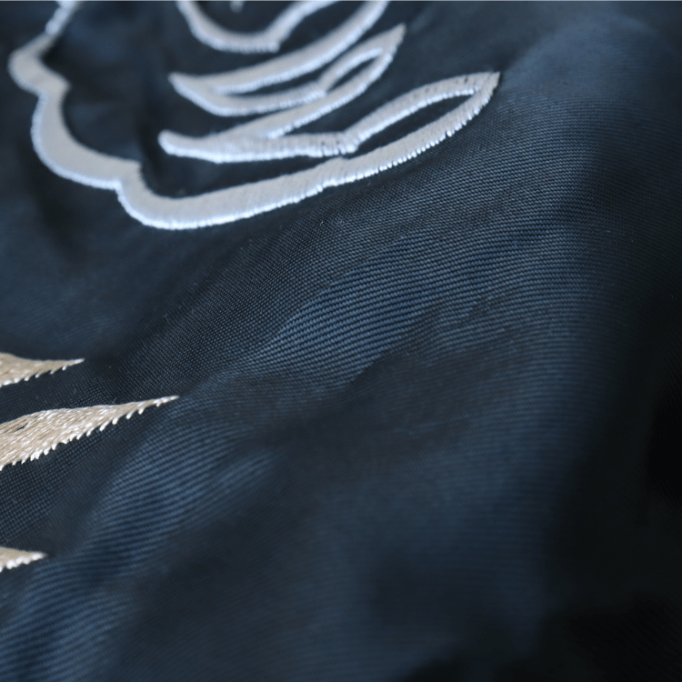 龍の顔や鱗の輪郭をグレーの色糸で描写することで横振り刺繍の